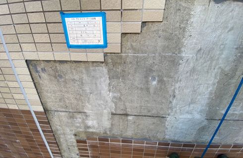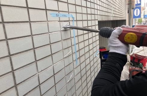 ピンニングエポキシ注入やモルタル張り、ボンド張り剥落部のタイルの撤去
