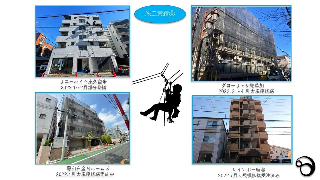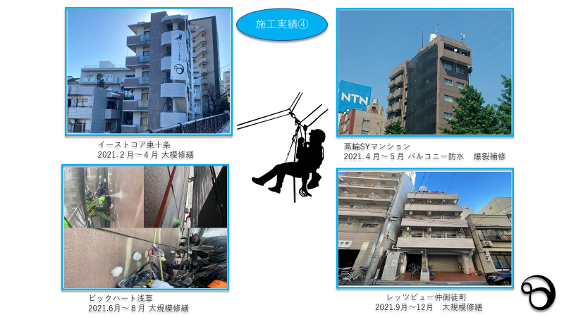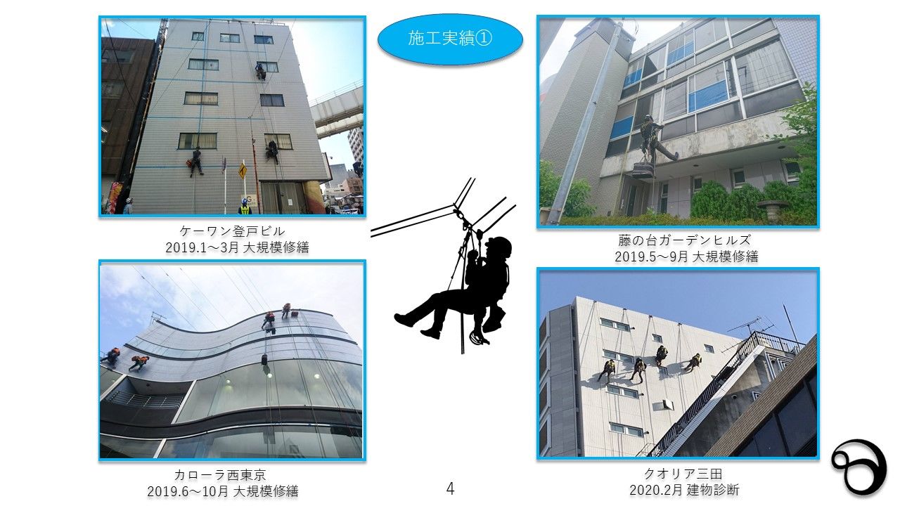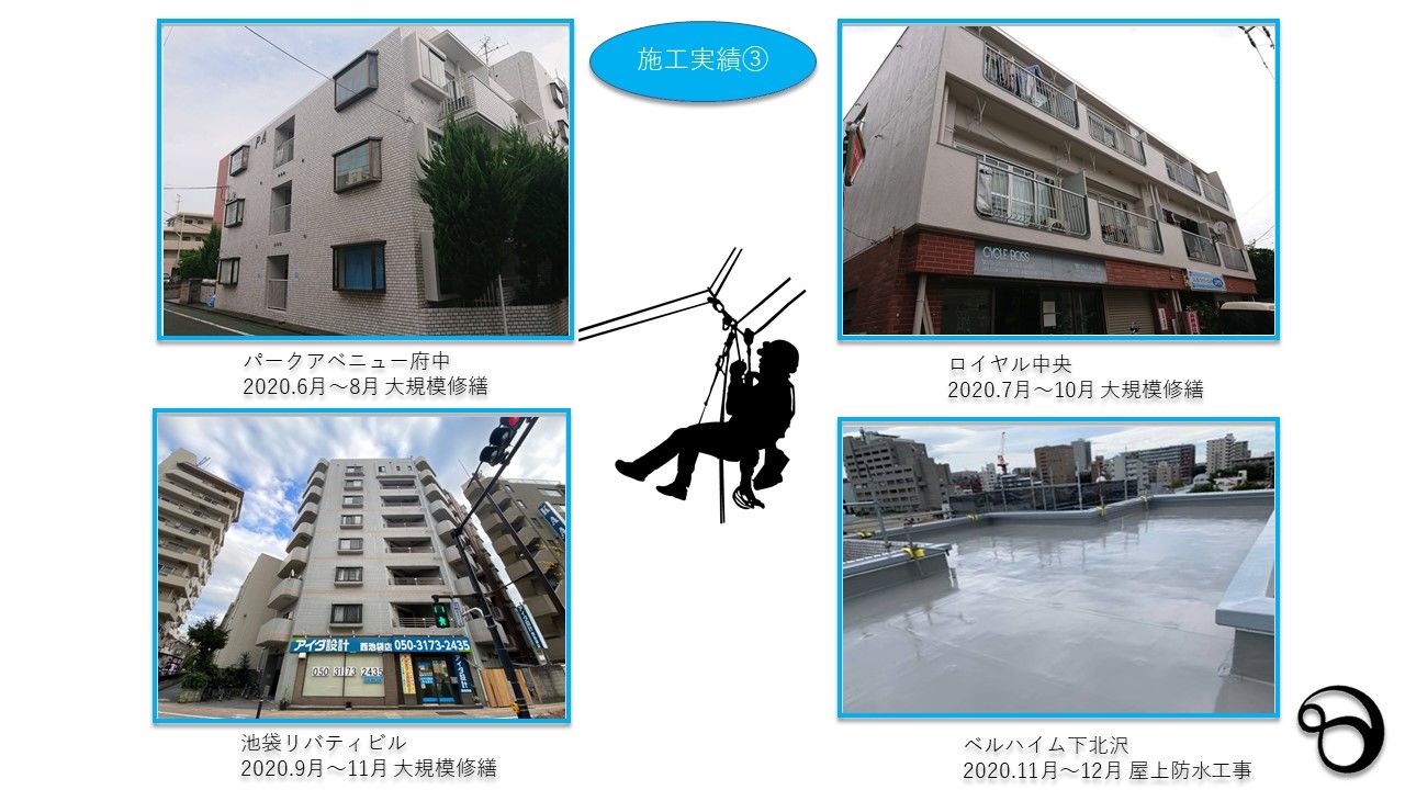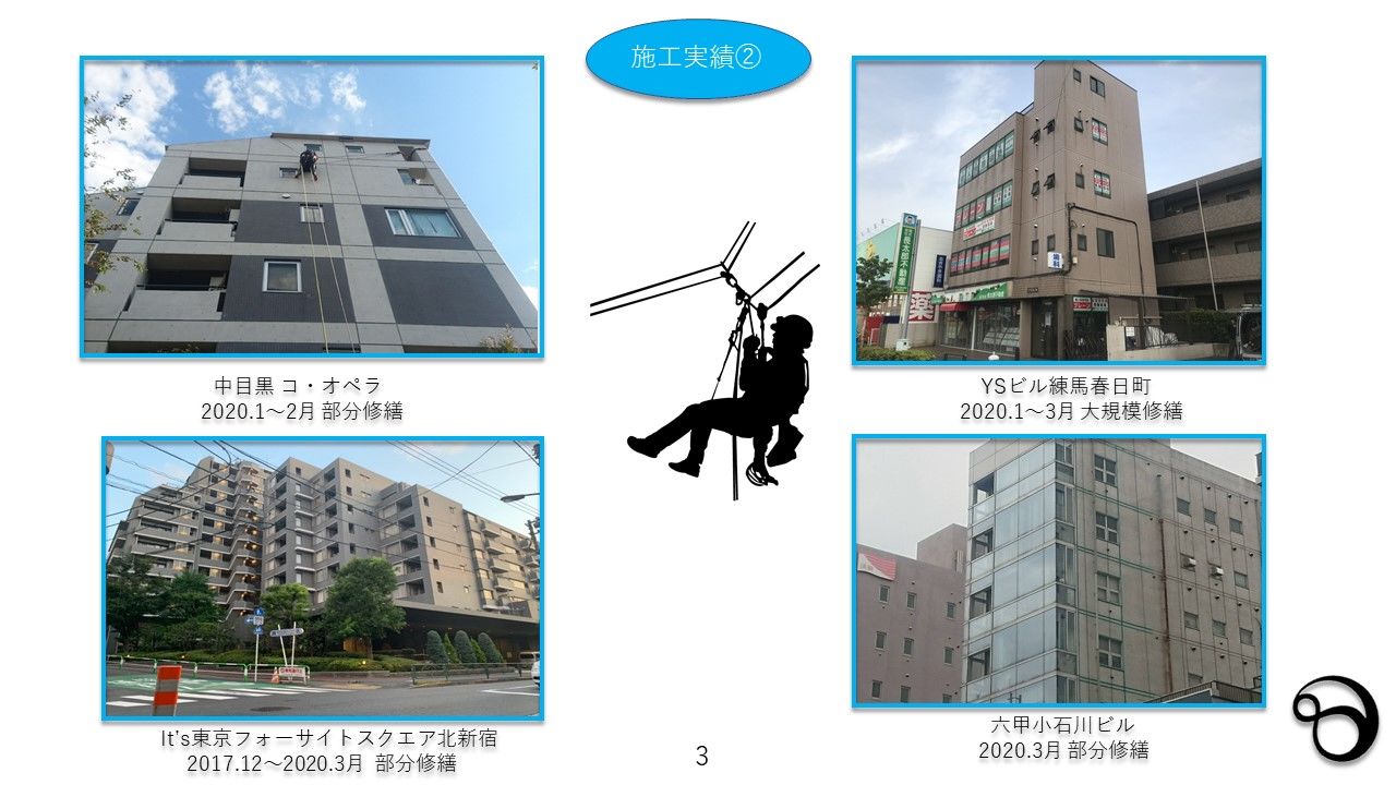 東京の株式会社リーベルハイワークスはロープ工事に実績があり、大規模修繕、小規模、一面修繕、部分修繕、建物にあった予算で修繕を行います。
